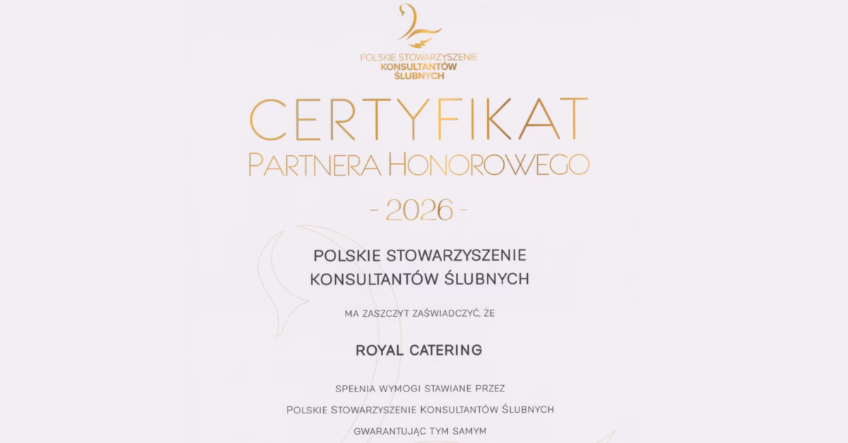 Z ogromną dumą ogłaszamy, że 14 listopada 2025r., podczas VI Gali Polskiego Stowarzyszenia Konsultantów Ślubnych, Royal Catering został uhonorowany Certyfikatem Partnera Honorowego 2026. To prestiżowe wyróżnienie jest dla nas nie tylko powodem do radości, lecz przede wszystkim potwierdzeniem zaufania branży, które budujemy konsekwentnie od lat, realizując projekty eventowe…